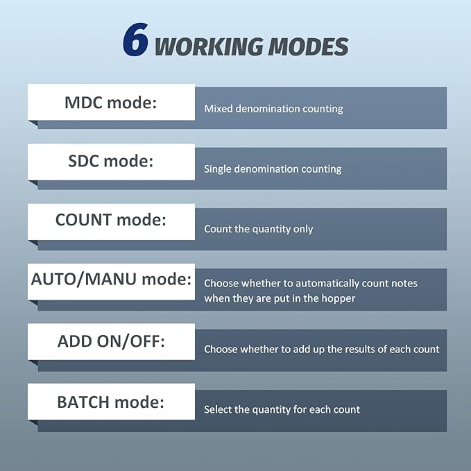 - 6 Modes Available--- With 6 modes including mixing denomination counting mode, batch mode, add mode and more, this money counter machine has the power to meet most domestic and commercial needs.