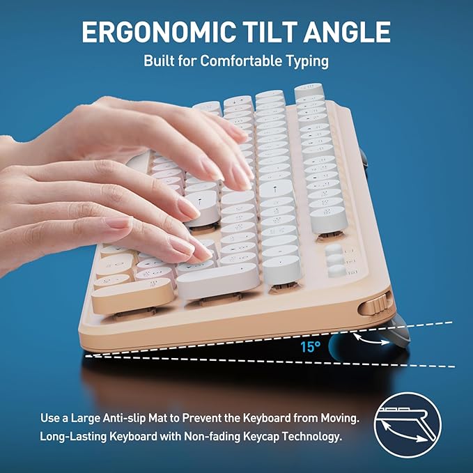 - 【 Wireless Keyboard Mouse Combo】The inspiration for these cute rounded keys comes from vintage typewriters offering you visual enjoyment and a retro feeling to type. With colorful key caps, make you be distinctive in the office and work full of fun.