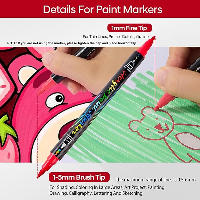 - PREMIUM DUAL-TIP ACRYLIC PAINT MARKERS: Each paint pens come with a 1-5mm(the maximum range of lines is 0.5-6mm) flexible fiber brush tip and 1mm fine tip. You can drawing, sketch, calligraphy and outline with the fine nib, the brush tip is made of premium soft fiber material that is wear-resistant, no branching and durable, which is suitable for large-scale painting, coloring multiple colors layered on top of each other will not result in paper penetration.