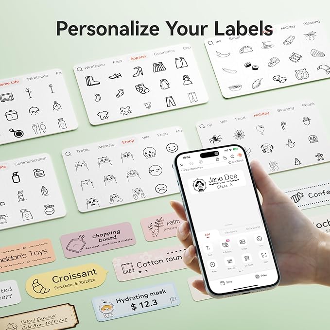 - 【Ideal Gifts】The NIIMBOT D110 Sticker Printer Machine is used widely in organizing home supplies - storage, food date marking, classifying cosmetics items, jar stickers; School name labels, study note and office files classification, cable identification, personal item identification, name tags; Small business - price tags, jewelry tags and more.