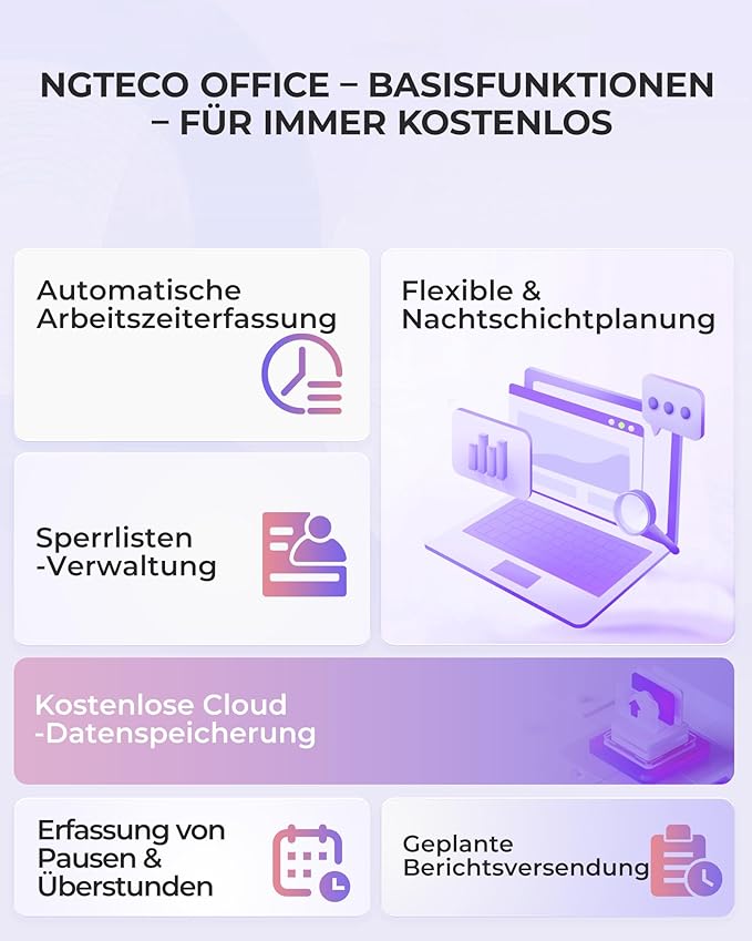 - Free Cloud Service: The TC1 Cloud-Connect time clock, powered by NGTeco Office software and app, allows you to access real-time punch data from anywhere. Benefit from accurate hour calculations and automatic report generation through any web browser.