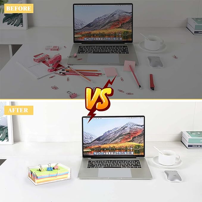 - Suitable Size: Size: 6.7"L x 4.7"W x 1.9"H, large enough to hold various 3x3, 4x4, 4x6 inch sticky notes. This notepad holder allow you to organize note pads and other office stationery at the same time. Such as book clip, eraser, pen, paper clips, etc
