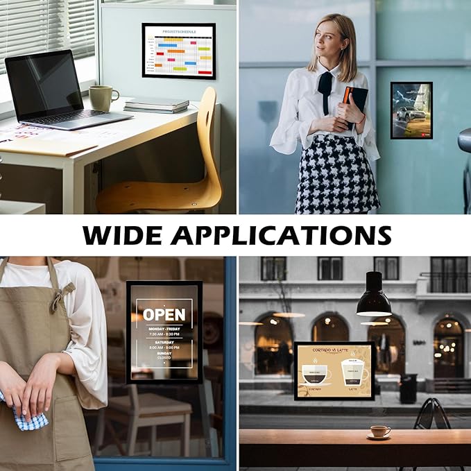 - Magnetic Frame: The magnetic sign holder features two durable PVC sheets and laminated magnet strips. Its strong magnetic attraction secures the poster, and the fully sticky back ensures stability. The transparent sheet clearly displays the poster