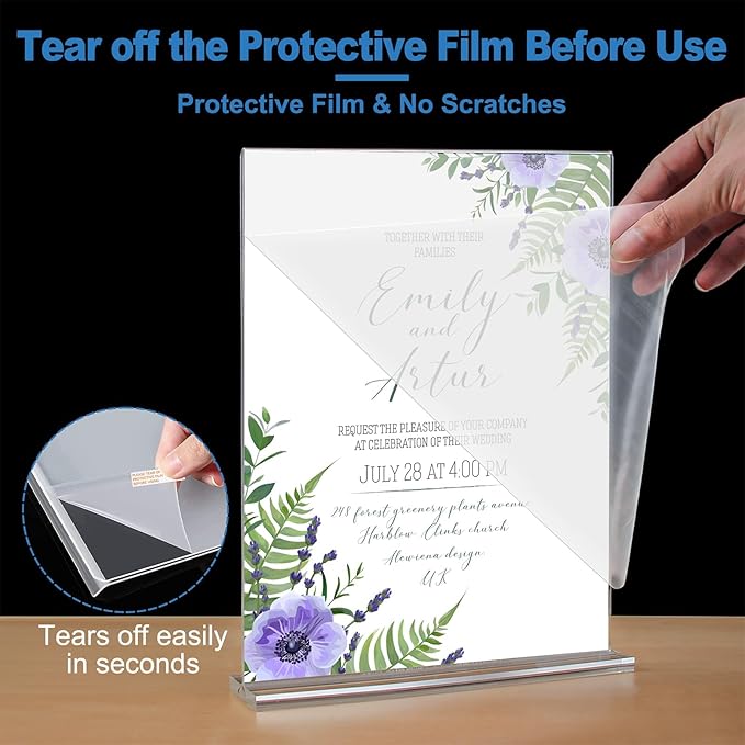 - Easy to Use: Insert 4 anti-slip pads into the base, Each of our Acrylic Sign Holder comes with a peel off film guide, follow the red arrows to peel off the film in seconds, Bottom-loading your paper