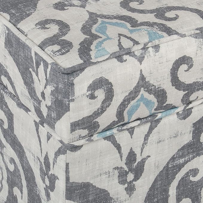 - STORAGE OTTOMAN: Featuring a hinged lid, our Blue and Gray Damask Fabric Storage Ottoman is designed with function and fashion in mind | Perfectly completed with tapered wood legs in a gray wash finish