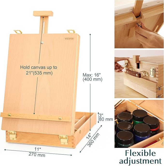 - [Portable Large Storage Box] With this wood easel box, you can keep painting supplies inside and take to anywhere. The lightweight design will not bring trouble to your travel. This art easel box is made of solid German Beechwood, sturdy and durable. Adjustable and high-quality, the tabletop easel is perfect for artists, Plein-air painters, students, adults.
