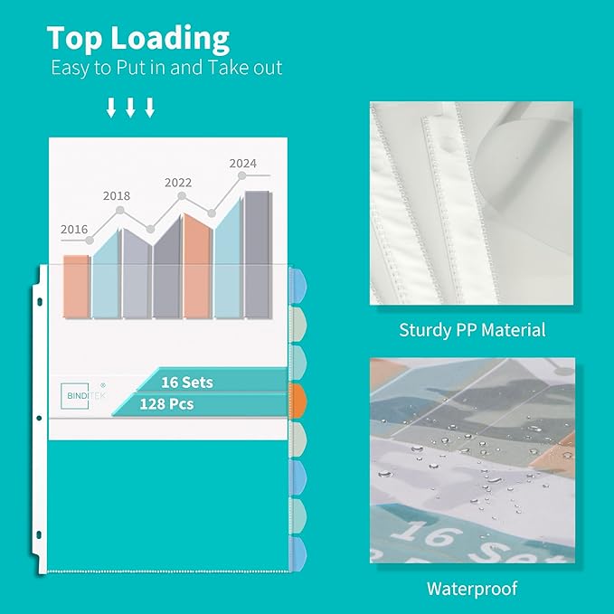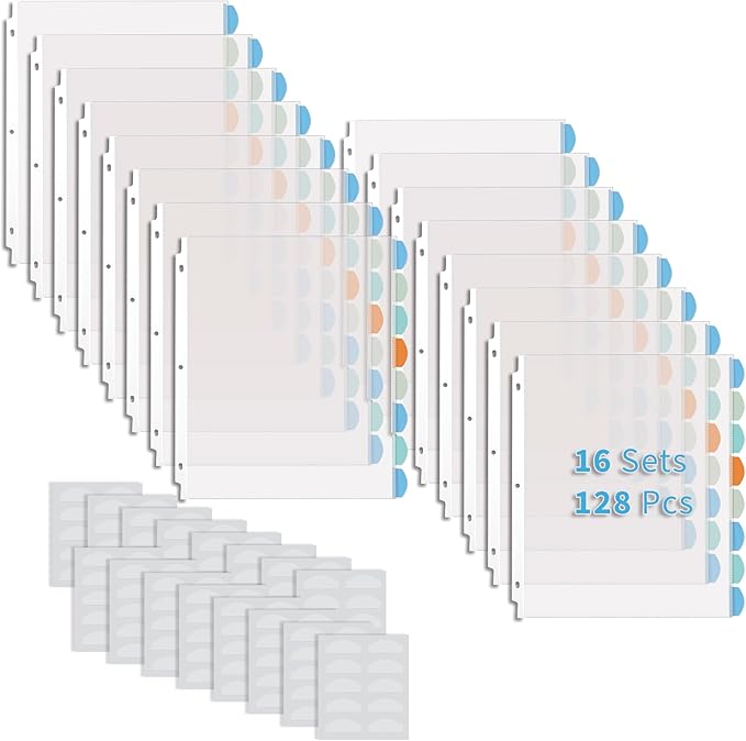 Binditek 128 Pack Heavyduty Clear Sheet Protectors with 8 Tabs, Sturdy Binder Sheet Protectors for 3 Ring Binder Letter Size, Multicolor Tabs, 8.5 x 11 Inches, Polypropylene, 16 Set, Label Sticker
