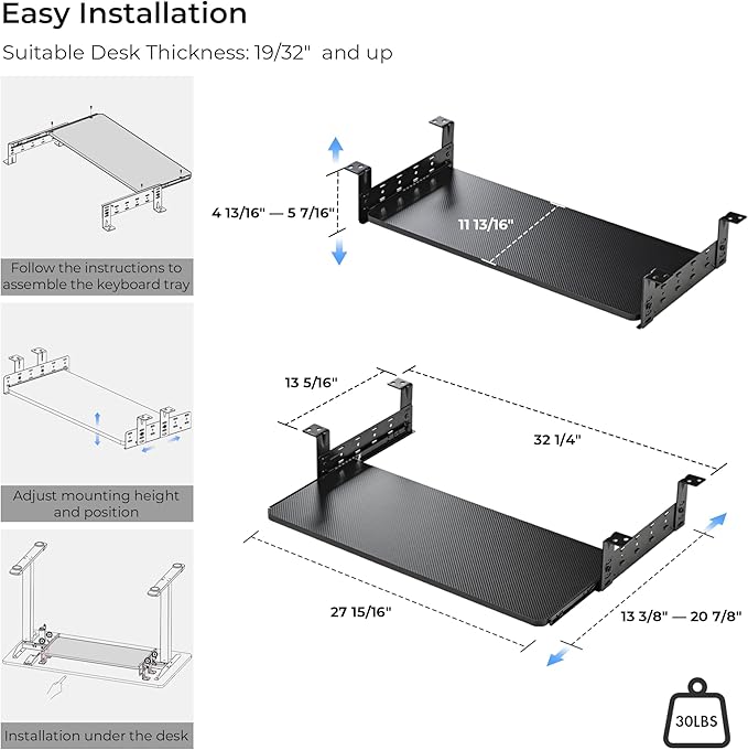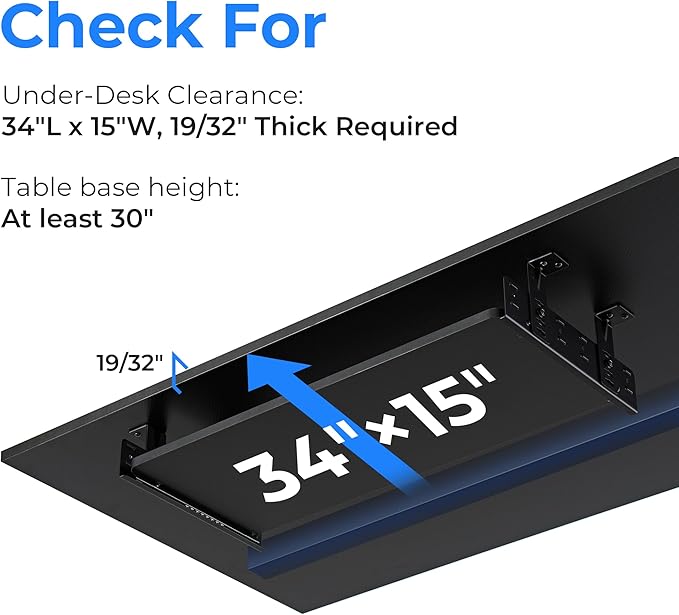 - 【Wide Compatibility】: This keyboard drawer is designed to be compatible with a wide range of desks, and is suitable for desktops made of materials such as wood, MDF, or other materials with similar characteristics (not compatible with plastic, hollow core panel, stone, glass, etc.). The keyboard shelf can be easily mounted under the desk for flexibility in adding desktop space. Note: The under-desk installation space should be 34"L x 15"W, with a minimum distance of 30" from the bottom of the tabletop to the floor. The desk should also be at least 0.59" thick. Please double-check the measurements and ensure there is enough legroom after installation before purchasing.