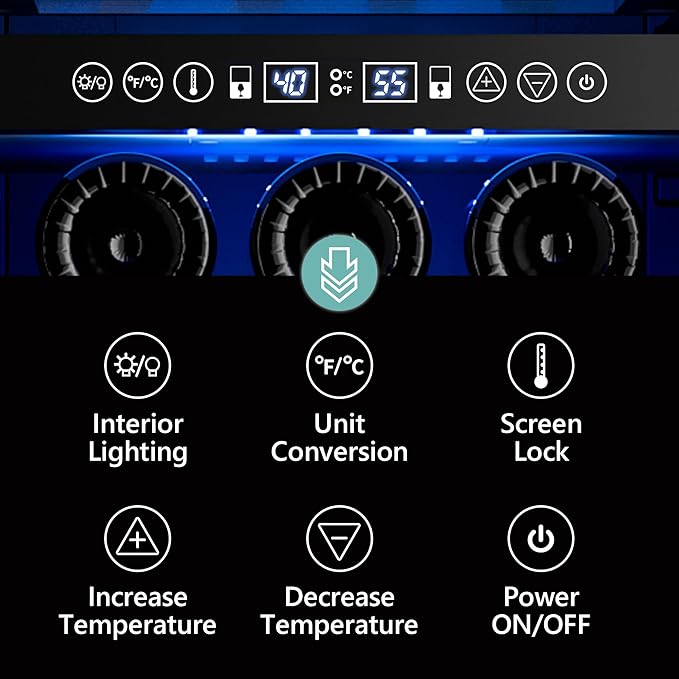 - 【Dual-zone Temperature Adjustment】Press the button to customize the temperature. The upper zone of wine refrigerator ranges from 40°F to 55°F, while the lower zone is 55°F-65°F. Different temperatures for optimal wine storage, ensuring pure enjoyment