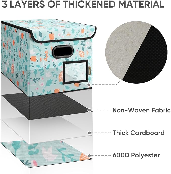 - [DURABLE MATERIAL] The outer layer of our filing box is crafted from high-quality polyester fabric and reinforced with thick cardboard in the middle. This construction ensures that the box maintains its shape and provides better bearing capacity for important documents and files. Its textured appearance can also serve as a stylish decorative element in any office or home.