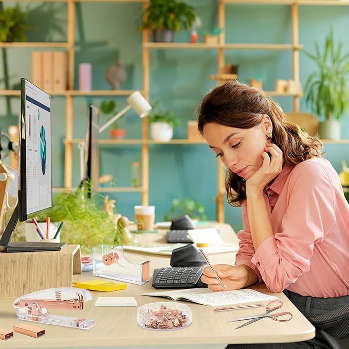 - Package Includes- This rose gold office supplies contains 1x Stapler, 1x Staple Remover, 1000x Rose Gold Staples, 1x Tape Dispenser, 1x Office Scissor, 20 x Push pins 7 x Big Clips 13x Small Clips 25x Paper Clips,2x Ballpoint Pens and 2x 50pcs Transparent sticky notes. Such a complete rose gold desk accessories combination is enough to meet your school and office using needs.