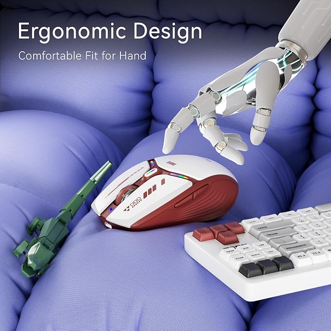 - MECHA-STYLE DESIGN: Classical color scheme, cool LED light and disassembly parts (magnetic case and nano receiver) make it a cool looking mecha-style wireless mouse. Take apart the mouse cover and take the USB receiver out, it's like dismantling the mecha parts. Enjoy the technology sense with this optical mouse.