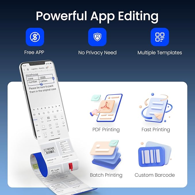 - Free and Powerful App: Experience fast and secure printing with our app, which requires no login or privacy permissions. Effortlessly customize your output with a wide array of free icons, fonts, and frames. Print text, barcodes, QR codes, tables, images, logos, and more with ease. Utilize various label templates along with batch printing,scan priting and PDF printing options to enhance your efficiency. Ideal for both small businesses and home use.