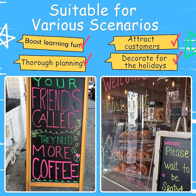 - Versatile Liquid Chalk Markers: These chalk pens are perfect for use on blackboards, whiteboards, windows, glass, mirrors, small chalkboards, car windows, and even as drink markers, making them ideal for back-to-school, office, home, and creative projects.