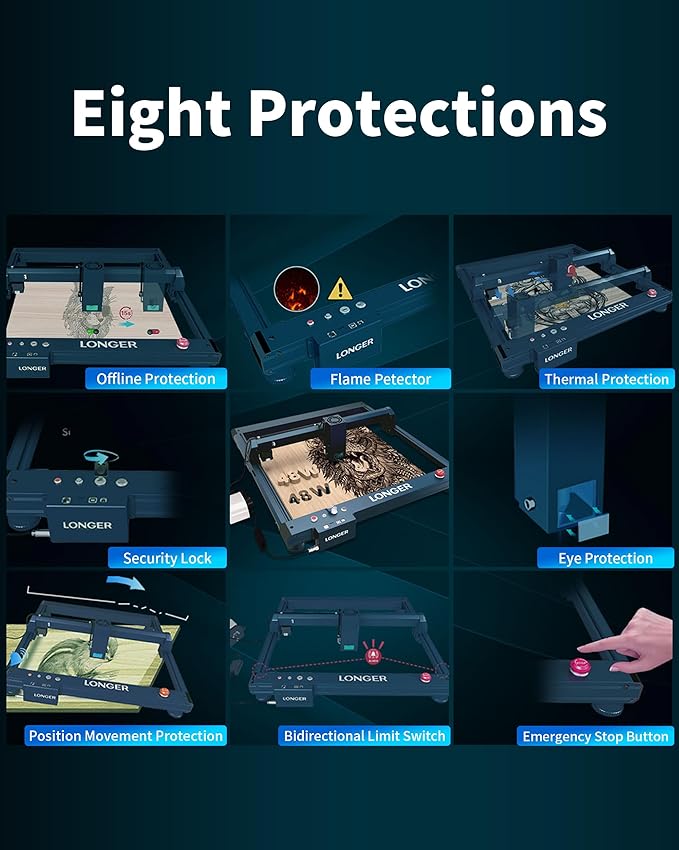 - Eight Safety Protection:Safety Lock: Restrict children from using the engraver; Laser Module Panoramic Filter Glass: Block blue light and filter 97% UV to protect eyes; Position Movement Protection: Stop the machine if it moves or tilts during operation; Flame Detector: Prevent wood burning for worry-free engraving; two Way Limit Switch: Alarm-triggered auto zero for laser head protection; Emergency Stop Button: Stop the machine for safety in accidents; Offline Protection; Thermal Protection