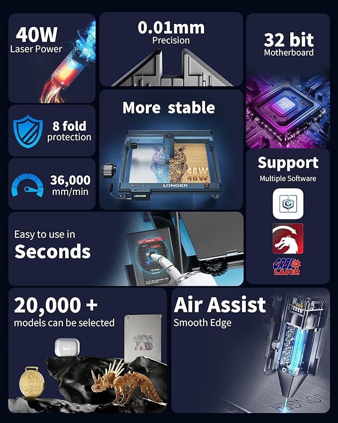 Longer B1 40W Laser Engraver with Auto Air Assist,48000mw Output Power Laser Cutting Machine for Laser Engraving on Wood and Metal, Glass, Leather