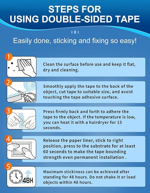 - 【Use Tips】1. Pressing: The greater the pressure, the stronger the stickiness. 2. Time: The longer the time, the stronger the stickiness, wait for 48 hours before hanging heavy object. 3. Temperature: When the construction temperature is low, please heat it with a hair dryer.