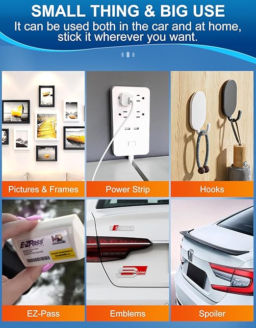 - 【Multi-Use Mounting Tape】The versatile design of this tape allows it to adhere firmly to a variety of smooth surfaces such as walls, glass, tiles, aluminum, metal, and wood. It can be used for posters, hooks, plastic hangers, signs, nameplates, metal plates, wire and cable clamps, security cameras, photo frames, and other car home school office decorations.