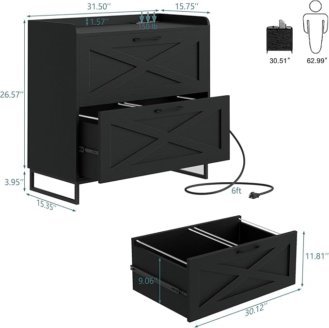 Lateral File Cabinet 2 Drawer File Cabinet with Charging Station for Legal/Letter/A4 Size Hanging Files, Modern Farmhouse Large Wood File Storage Cabinet Printer Stand for Home Office Furniture(Black)