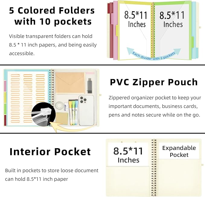 - 【Secure Storage】The portfolio organizer has a clear pouch with a zipper that provides a secure place to store documents, notes, or other items when you're on the go. The clipboard comes with 5 plastic folders that have 10 pockets, fitting all standard US letter-size sheets (11" x 8.5"). It is a great way to keep your papers organized and easily accessible.