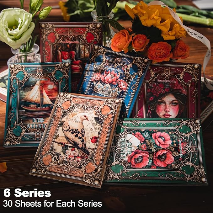 - Intricate Vintage Designs: This Red Velvet series features 6 unique vintage designs (180 sheets in total), each with detailed artwork to inspire your creativity. Ideal for adding a nostalgic touch to your journals, scrapbooks, and various craft projects.