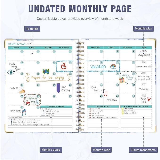 - Boost Your Productivity: Additional accessories included: instructions, bookmarks, stickers, and labels. Whether for work, study, or personal use, undated planner is the perfect tool for achieving your daily priorities and taking control of your schedule.