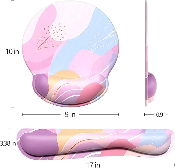 - Optimal Size: 17*3.38*0.9 inch keyboard wrist pad offers more support to your wrist, 10*9*0.9 inch large mouse pad allows your mouse to move freely. Perfect size fits most keyboards, laptops and mice