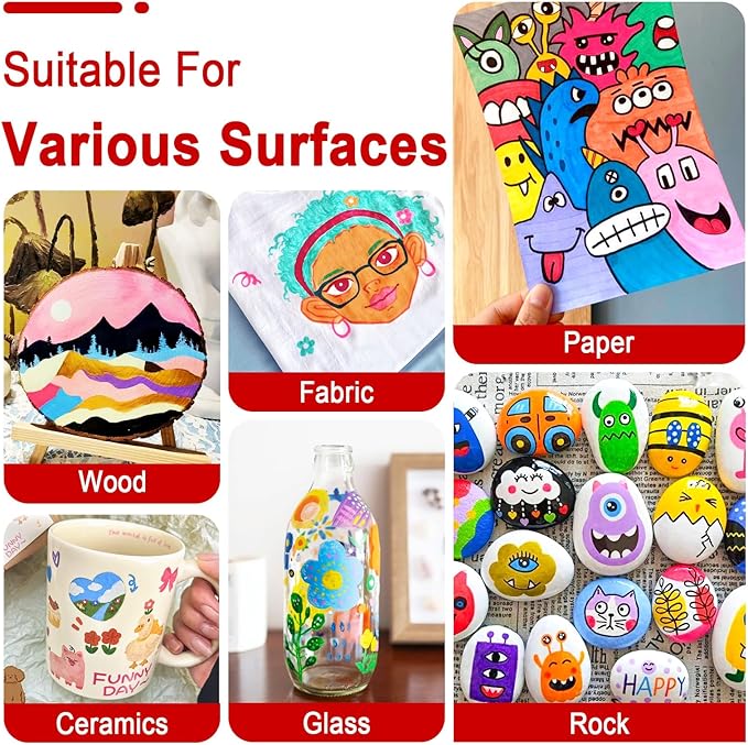 - Working on Any Surface: Our acrylic dual tip markers are suitable for use on almost all surfaces, including ceramic, wood, fabric, stone, metal, plastic, canvas, shoes, eggs, paper, clothes, models, leather, create DIY arts and crafts graffiti projects on a wide variety of surfaces to your heart's content.