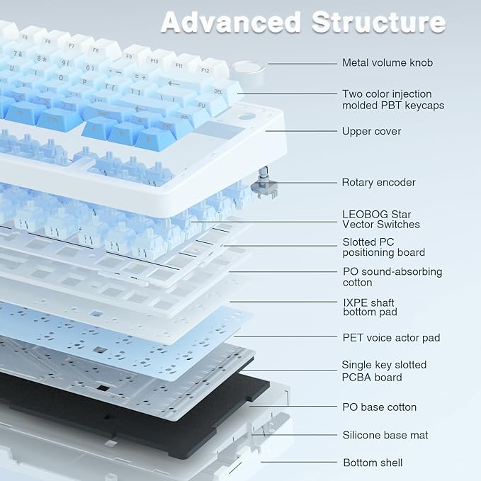 - Hot-swap Custom Keyboard: This custom mechanical keyboard with hot-swappable base supports 3-pin or 5-pin switches replacement. Even keyboard beginners can easily DIY there own keyboards without soldering issue. F75 Pro gaming keyboards equipped with pre-lubricated stabilizers and LEOBOG star vector switches, bring smooth typing feeling and pleasant creamy mechanical sound, provide fast response for exciting game