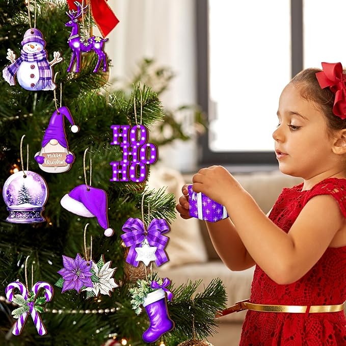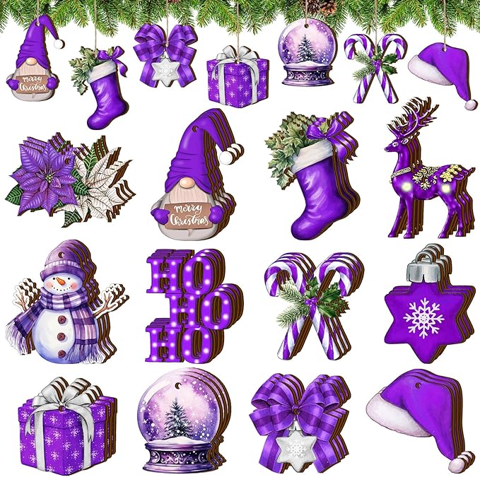 Huwena 36 Pcs Christmas Wooden Ornaments Purple Christmas Decorations for Tree Snowman Gnomes Poinsettia Flowers Truck Wreath Wood Cutouts Tags with Ropes Winter Decor for Xmas Tree Gifts