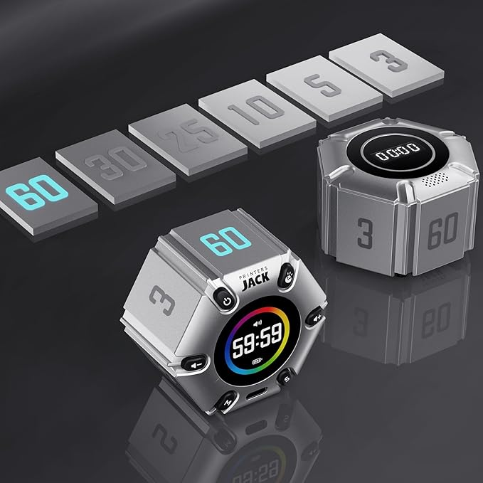 - Unique design: The Printersjack pomodoro timer is designed to make your life more efficient and relaxing. It features six preset countdown times—3, 5, 10, 25, 30, and 60 minutes—that are activated with a simple flip. Additionally, you can customize the countdown using the M and S buttons below, which allow you to increase the time. This clock helps you manage your time effectively and take control of your day.