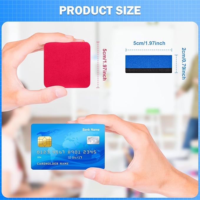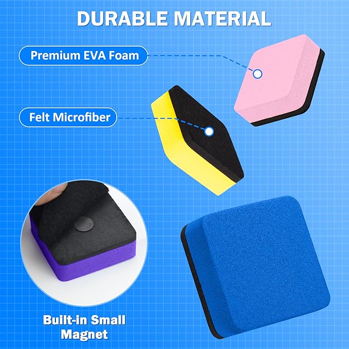 - DURABLE AND WASHABLE: Our dry erasers are made of premium quality EVA foam and high-density felt bottom, non-toxic, and easy to clean the erase markers on glass or white board. And the felt side of the eraser is magnetic and can be absorbed to the whiteboard. The erasers are hand-washable with water and soap for reuse