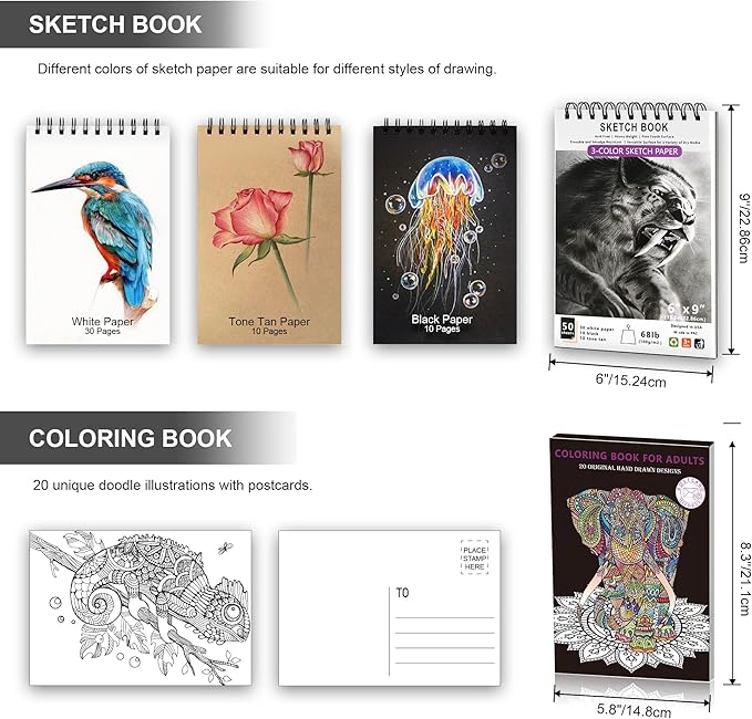 - 【Unique 3-Color Sketchbook and Coloring Book】6 x 9", 100GSM, 50 Pages (30 pages white, 10 pages toned tan, 10 pages black) - Different colors of sketch paper are suitable for different styles of drawing, one sketchbook can meet your needs for different colors of sketch paper, no need to spend more money to buy different colors of sketchbooks.A5 coloring book,160GSM,20 unique doodle illustrations,premium paper accepts a variety of coloring tools.Each illustration also is a postcard that can be mailed anywhere as long as it is stamped.