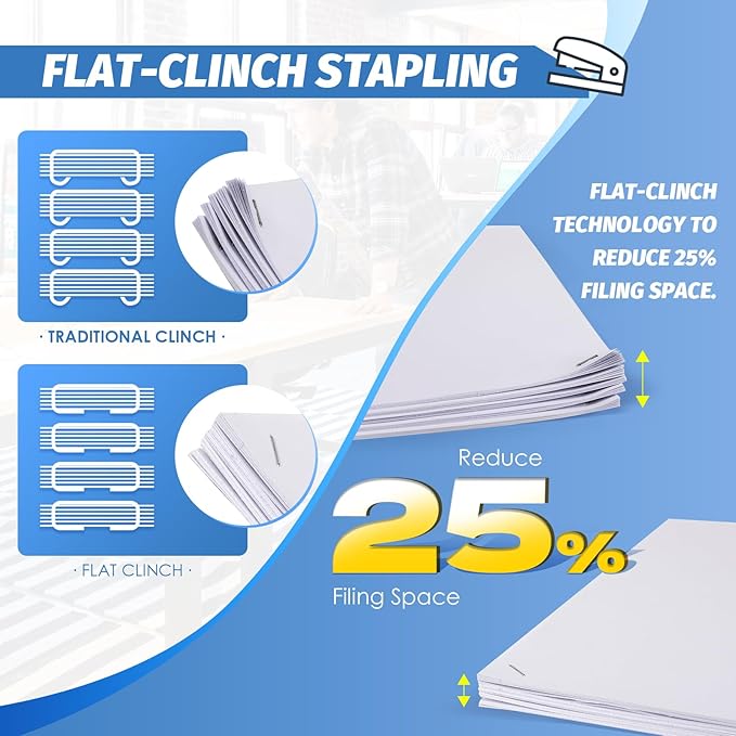 - Flat Clinch Design--- Unlike traditional staplers, this electric stapler uses flat-clinch technology, which saves 25% of document storage space for neater binding.