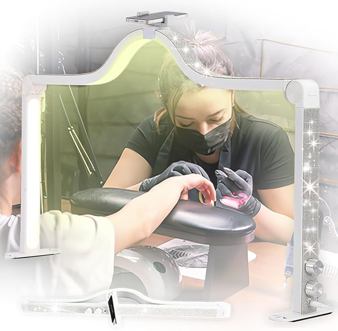 - Half-Moon Nail Table Lamp: The LED nail table lamp adopts a 35-inch design, a tall and compact arched structure, an arc-shaped nail lamp, and a hump design to make the light brighter. Its appearance adopts shiny, closely arranged small diamonds, which is an ideal auxiliary equipment for nail work.