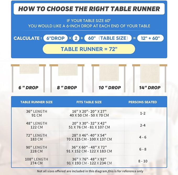 - Fits Table Size : This table runner is 13 x 60 inch, appropriate for a table that can seat 2-4 people, better match your table and give you a delightful dining experience