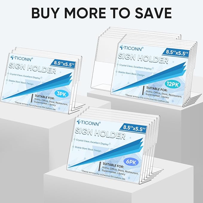 - [SLANT BACK] TICONN Horizontal 8.5x5.5 acrylic sign holder features a stable slant-back design for optimal viewing angles, making it perfect for showcasing photos and advertisements with ease. Papers can be effortlessly replaced from either side. PLEASE NOTE the front and back are covered with protective film, please peel them off before use