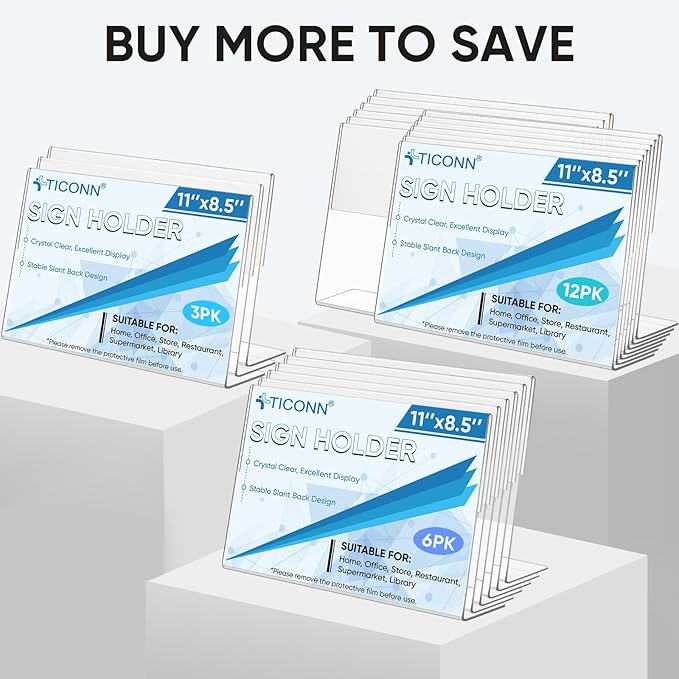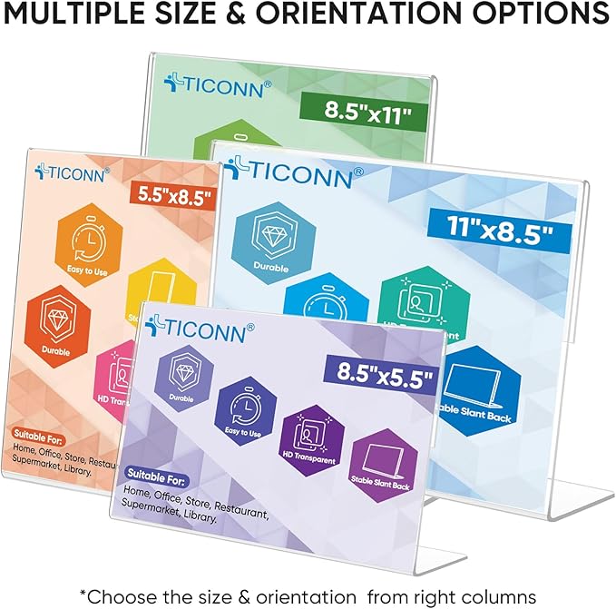 - [SLANT BACK] TICONN Horizontal 11x8.5 acrylic sign holder features a stable slant-back design for optimal viewing angles, making it perfect for showcasing photos and advertisements with ease. Papers can be effortlessly replaced from either side. PLEASE NOTE the front and back are covered with protective film, please peel them off before use.