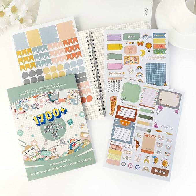 1700+ Planner Stickers Book, 24 Sheets Waterproof Repositionable Stickers for Journal, Bullet Planner, Scrapbook & Calendar, Functional Decorative Sticker Set & Gift (Boho Style)