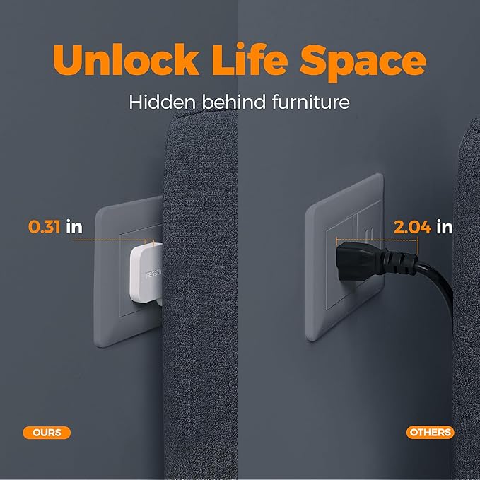 - 6 FT Flat Extension Cord: The only 0.31 in ultra thin flat head design allow this flat power strip to easily fit in narrow spots and hide behind furniture like sofa, bed, sitting flush and nightstand, against the wall; Right angle design 45 degrees provides additional space for other plug without blocking