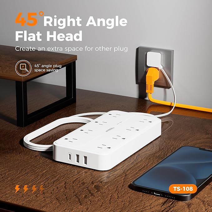 Power Strip with Surge Protection, TESSAN Flat Plug Extension Cord with 8 Outlets 3 USB Ports(1 USB C), 1080 Joules, 6 Ft, Wall-Mounted Charging Station for Apartment Office Dorm Room Essentials