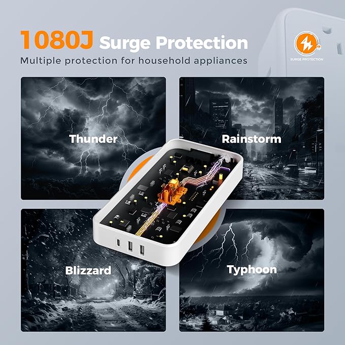 - Surge Protector Power Strip 1080J: Overload, short-circuit, and over-current protection are all included; Reliable on/ off switch can automatically shut off and protect your expensive electronics, giving you with a safe and reliable charging environment