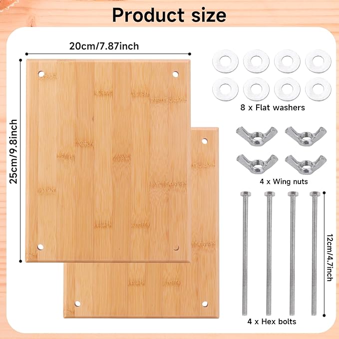 - Included Components : 2 x Wooden and bamboo book press, 4 x Hex bolts, 4 x Wing nuts, 8 x Flat washers