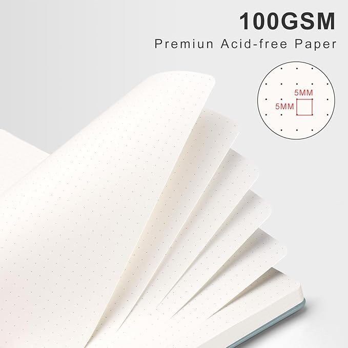 - 100 GSM PREMIUM PAPER: Our dotted notebook adopts 100 GSM acid-free thick paper in a light ivory color, ink-friendly, and prevents ghosting and feathering, making it perfect for various pens, including fountain pens, pencils, ballpoint and gel