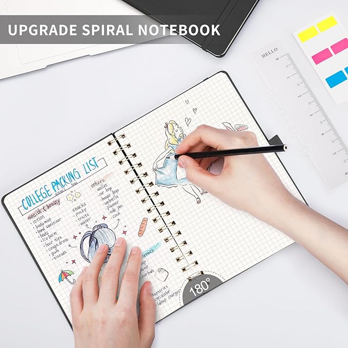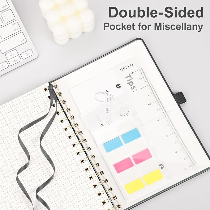 - PRACTICAL LAYOUT: Equipped an elastic band, a pen holder and removable bookmark ruler to keep your notebook organized. Comes with a DIY bookmark with a ribbon for self-attachment to the spiral, serving as a bookmark. Features a double-sided pocket for storing miscellany and 18pcs sticky notes for additional organization and reminders