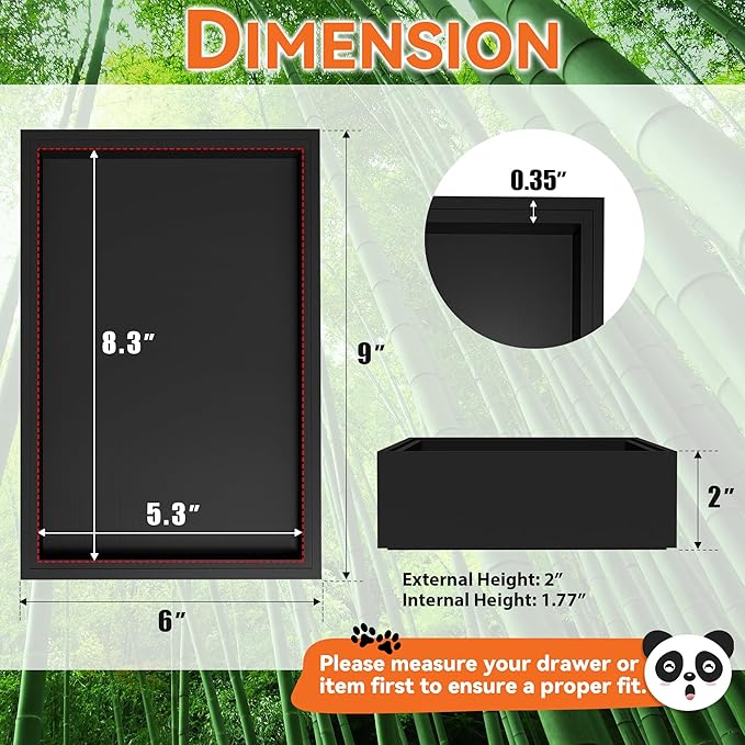 - Each bamboo drawer organizer measures: external size: 9" L x 6" W x 2" H; internal size: 8.3" L x 5.3" W x 1.77" H. Please check the size before purchasing