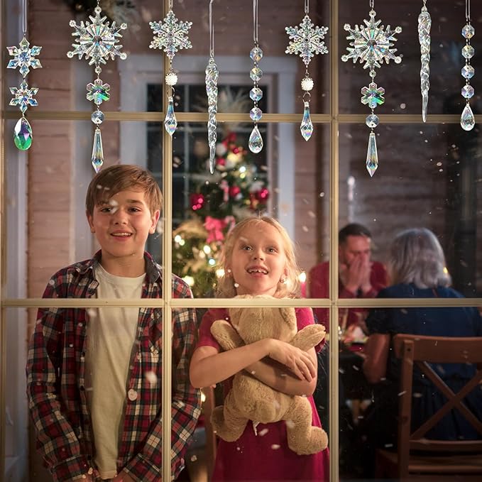 - EASY TO USE: Each crystal snowflake and icicle pendant ornament comes with a built-in rope for effortless hanging. Simply thread the rope through the included hooks or hang them directly from tree branches, door frames, or ceiling hooks. The convenient hanging design makes decorating a breeze and ensures your ornaments stay securely in place, whether on Christmas tree, doors, walls, or windows