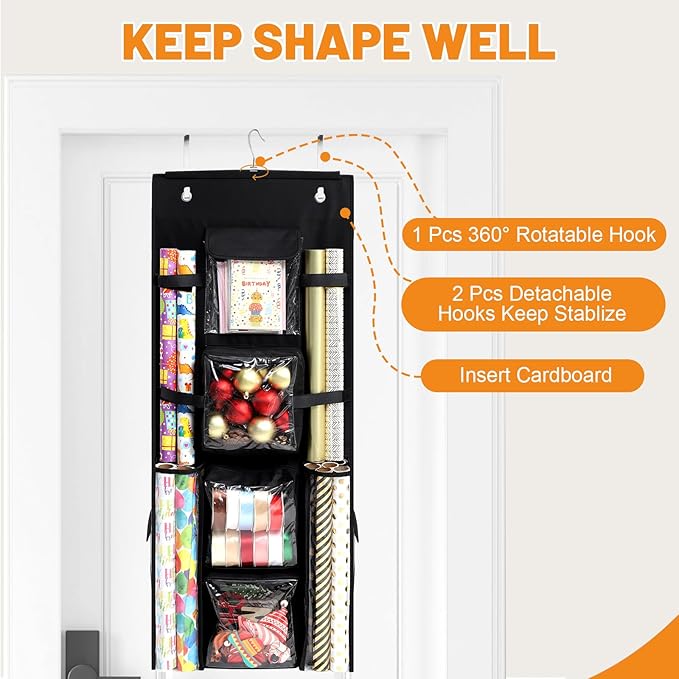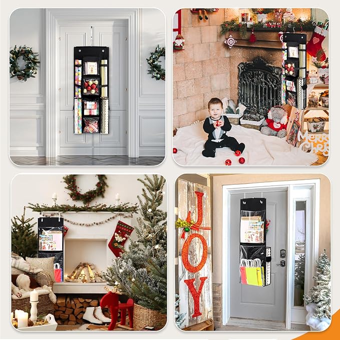 - 【One-piece Design】No assembly required, all pocket designs are on over the door organizer, which is convenient for storing and organizing wrapping paper, gift bags, greeting cards, envelopes, handmade creation tools, etc., so that your unused Christmas, birthday or wedding gift wrapping paper can be kept tidy. Transparent design, easy to take and clearer organization. In addition, this storage bag can be folded for storage when not in use, taking up less space.