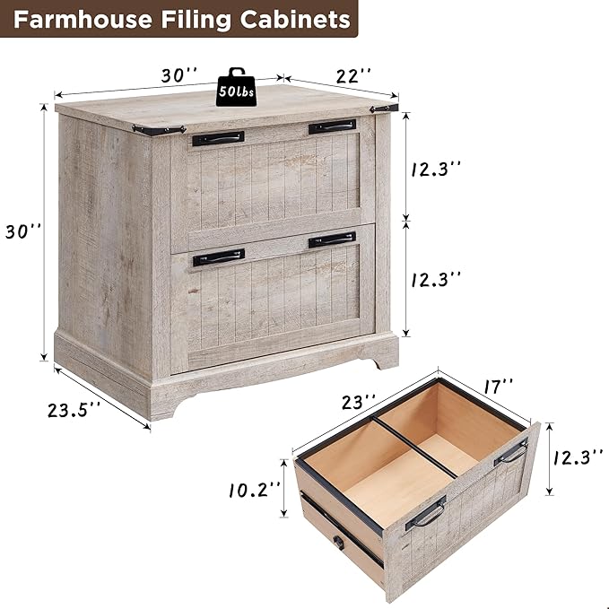- Sturdy Construction: The filing cabinets are produced from high-quality engineered wood and are built to endure daily application and provide lasting storage. Designed with the customer in the forefront of the mind, this 2-drawer farmhouse file cabinet combines functionality and aesthetics. Tabletop can hold up to 50lbs.