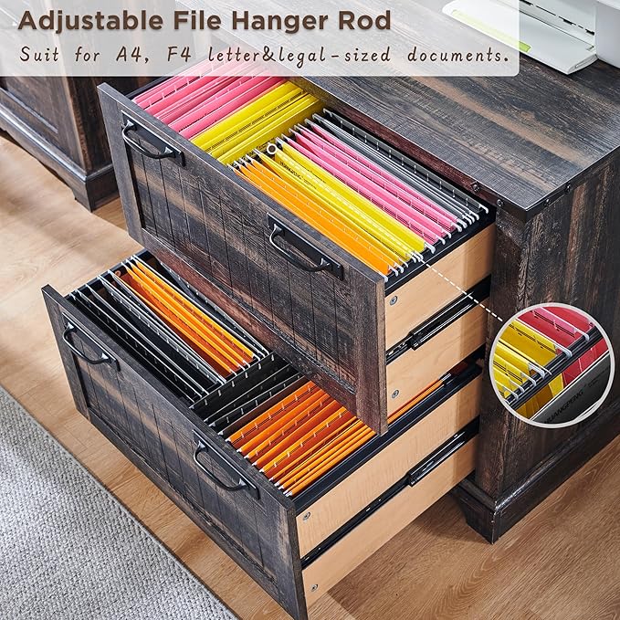 - Large Capacity Storage: Feature with 2 large drawers and possesses a vast interior space, which can effortlessly accommodate a large number of files, folders, and various office supplies. The file hanger rod design and reasonable zoning facilitate the classified storage of different types of files and improve the storage efficiency.